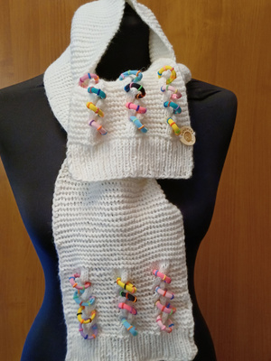 Но главная изюминка — в деталях! ✨ Концы шарфика украшены игривыми разноцветными резинками для волос, вплетенными в узор. Это не просто декор, а классный тактильный элемент, который так нравится детям перебирать пальчиками.
