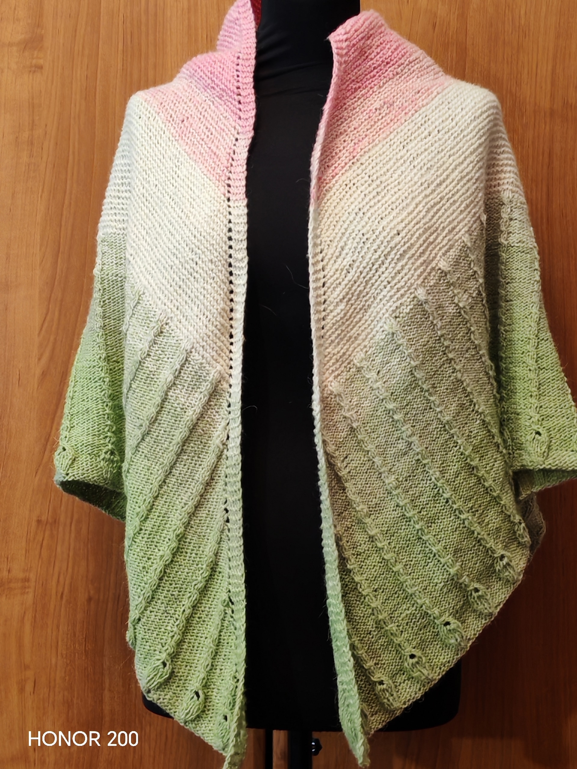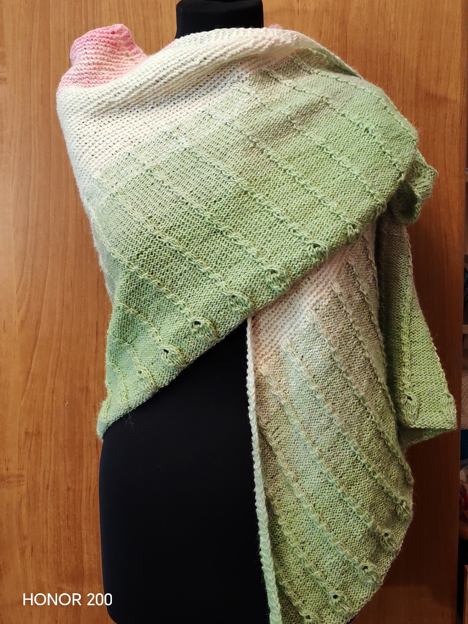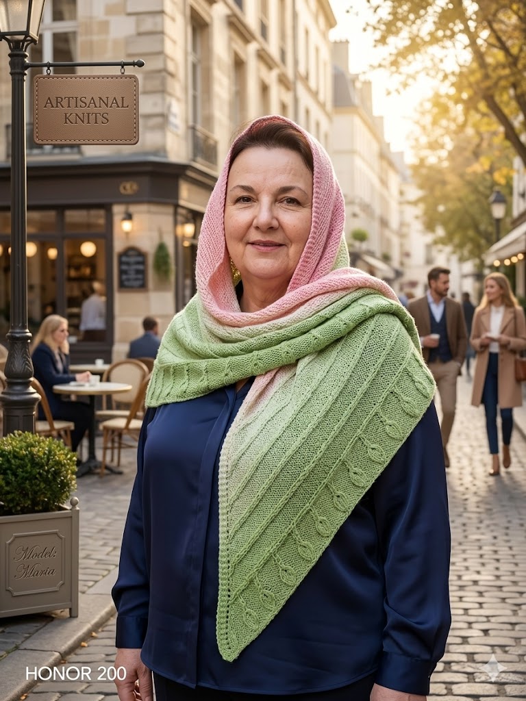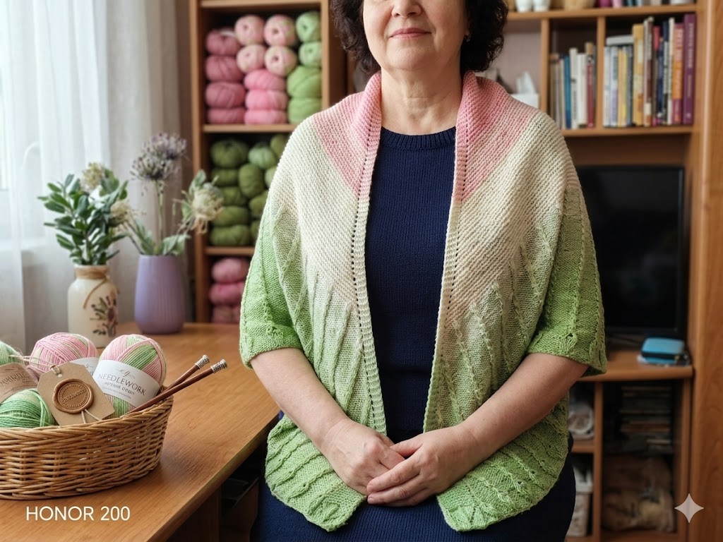 Мягкий градиент от пудрового зефира до глубокого фисташкового оттенка создает по-настоящему весеннее настроение, даже если за окном еще лежит снег. Сложная диагональная фактура и ажурные акценты подчеркивают эксклюзивность ручной работы, превращая шаль из просто аксессуара в центральный элемент вашего образа.