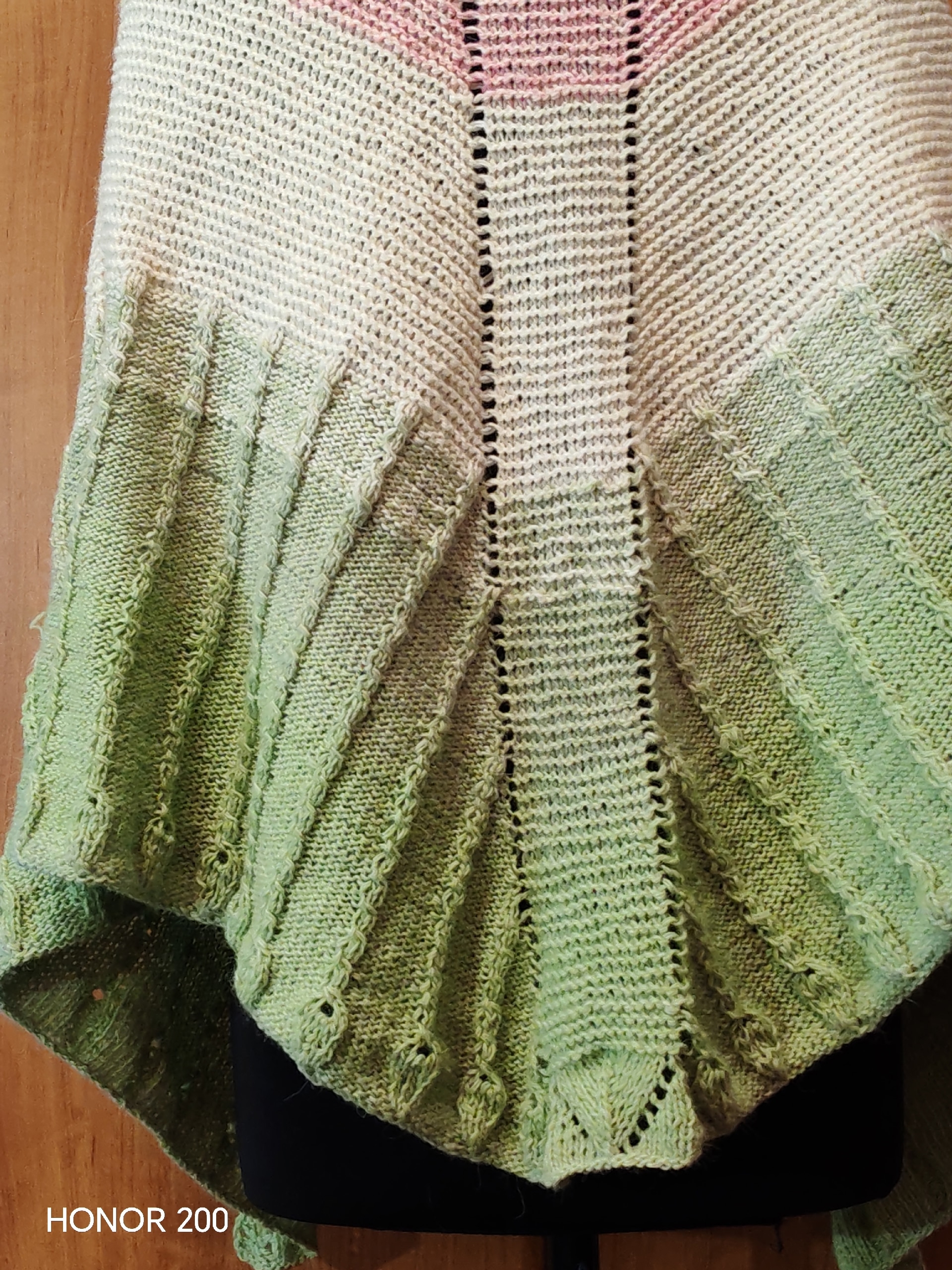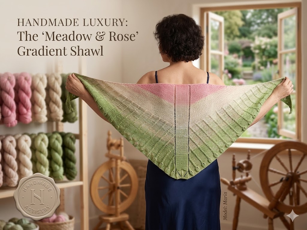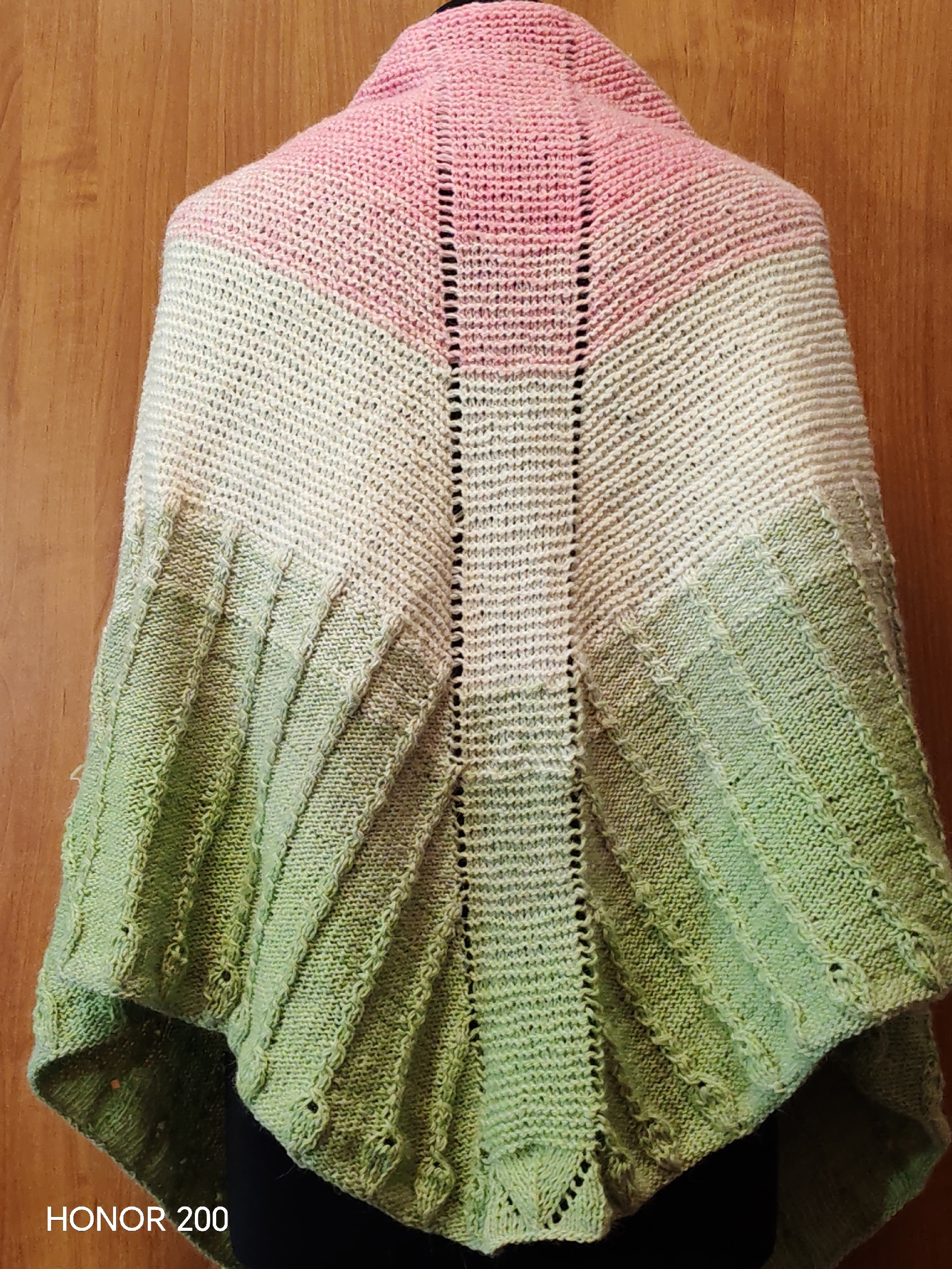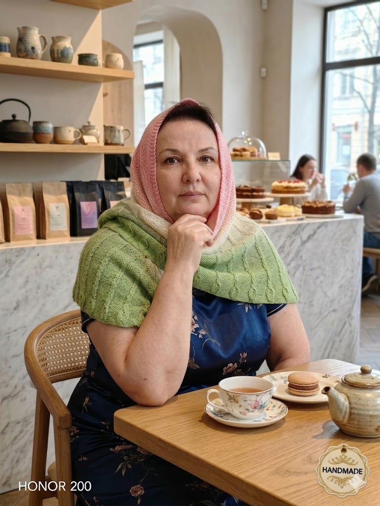 Мягкий градиент от пудрового зефира до глубокого фисташкового оттенка создает по-настоящему весеннее настроение, даже если за окном еще лежит снег. Сложная диагональная фактура и ажурные акценты подчеркивают эксклюзивность ручной работы, превращая шаль из просто аксессуара в центральный элемент вашего образа.