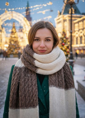 Этот невероятно длинный и мягкий шарф создан для тех, кто ценит эстетику и абсолютный комфорт в холодное время года. Сочетание молочно-белого и глубокого тёмно-коричневого цветов делает его универсальным аксессуаром, который одинаково эффектно дополнит как классическое пальто, так и объёмный пуховик.