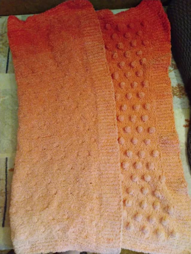 Цвет пледа — нежный персик — это потрясающий кораллово-розовый градиент. Уникальный переход от теплого кораллового к пудрово-розовому напоминает нежные оттенки утреннего неба, создавая атмосферу спокойствия и заботы.