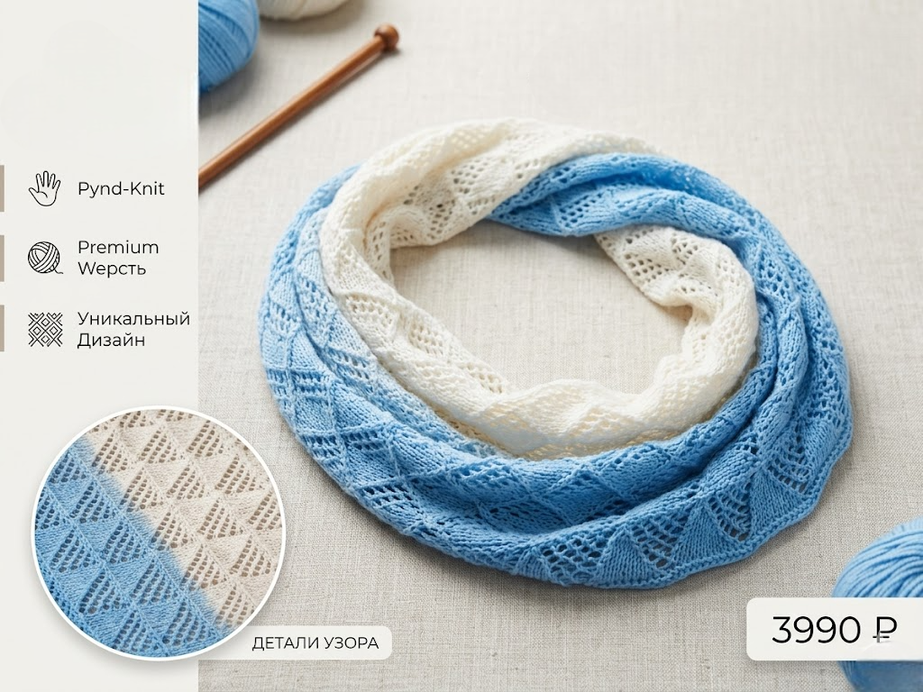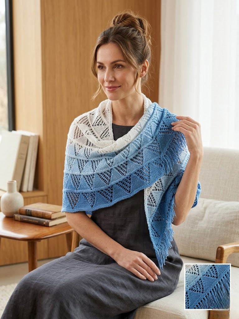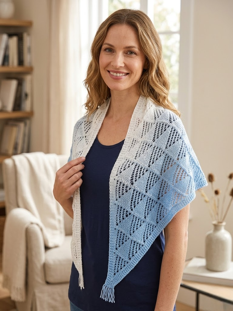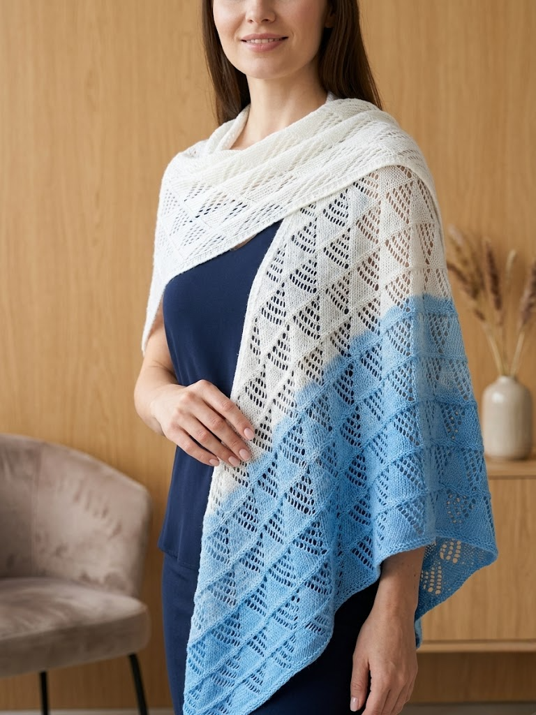 Добавьте образу легкости и изящества с нашей ажурной шалью ручной работы. Плавный переход от насыщенного небесно-голубого к безупречному белому напоминает морской бриз или ясное утреннее небо. Это не просто аксессуар, а ваш личный островок уюта.