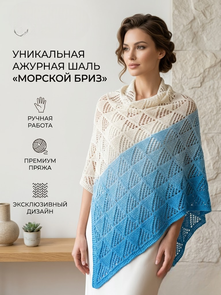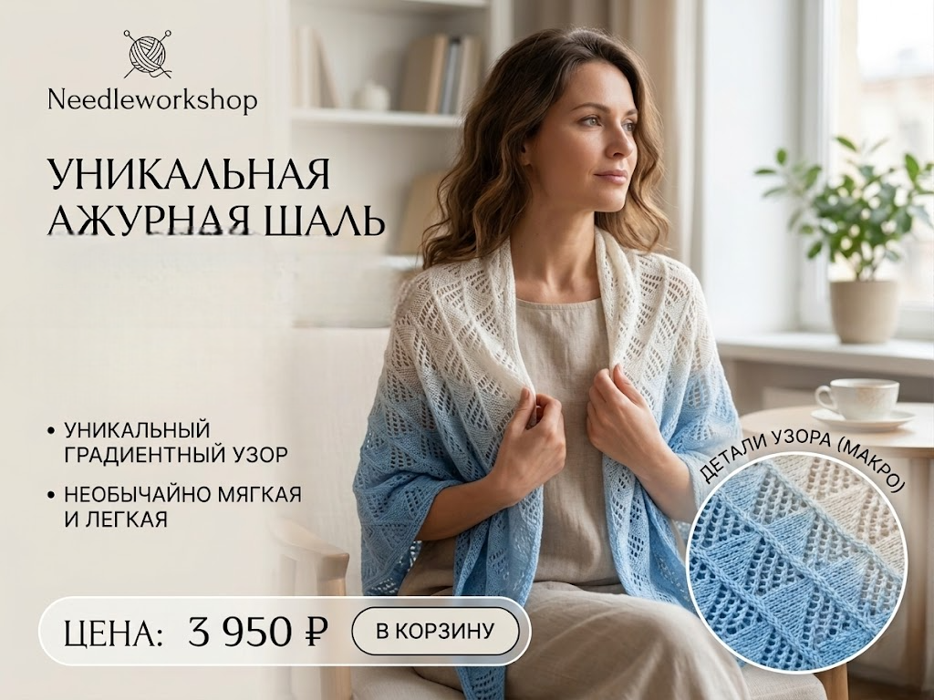 Шаль "Морской бриз" рождается в руках нашего мастера Елены, которая с любовью и вниманием к деталям воплощает в жизнь идею уюта и натуральности. В процессе создания используется акрил высокого качества, выбранный за мягкость и долговечность, что обеспечивает комфорт и гипоаллергенность. Каждая петля – результат кропотливой ручной работы, отражающей философию Needleworkshop тепло, уют и экологичность в каждом изделии.