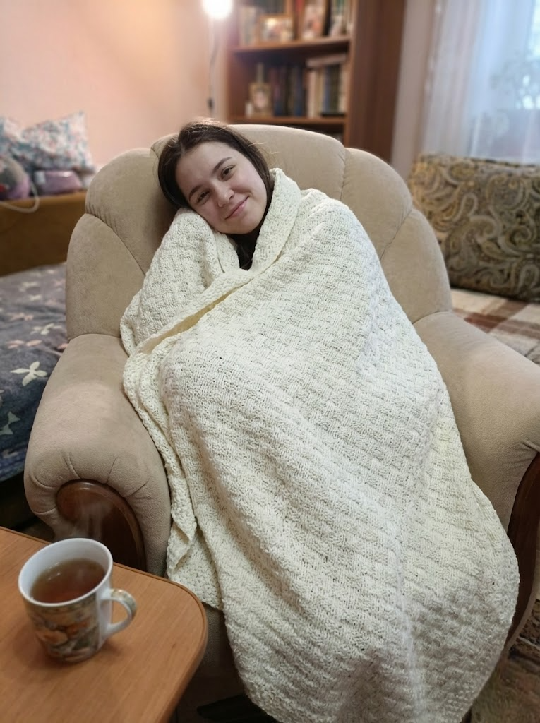 Плед превзошёл ожидания: мягкий, тёплый и лёгкий, идеально подходит для холодных вечеров. Особенно ценю натуральные материалы и бережную ручную работу — чувствуется душа мастера в каждой петле.