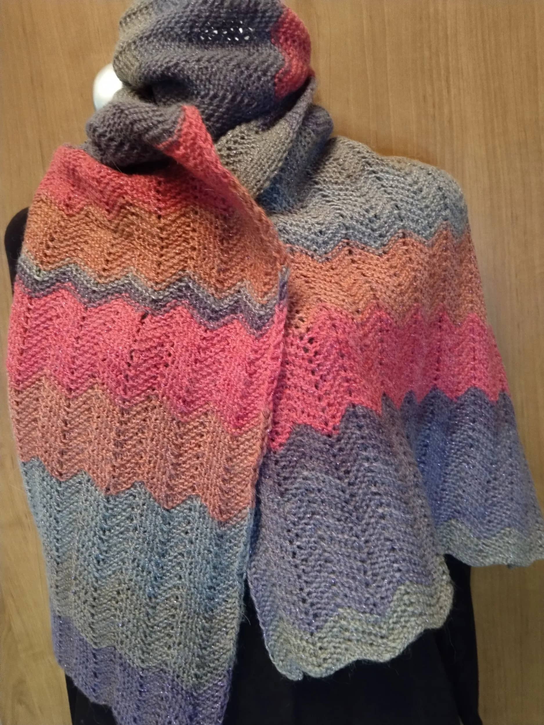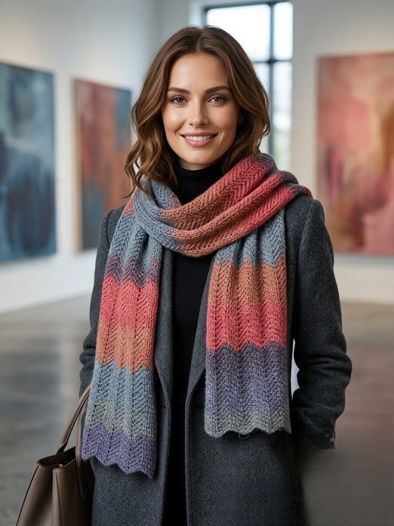 Уникальный волнообразный узор «Шеврон» создает динамичный ритм и подчеркивает плавные переходы градиентной расцветки. Сочетание глубоких ягодных, теплых терракотовых и спокойных серо-голубых оттенков позволяет легко комбинировать палантин как с классическим пальто, так и с повседневными куртками или кардиганами.
