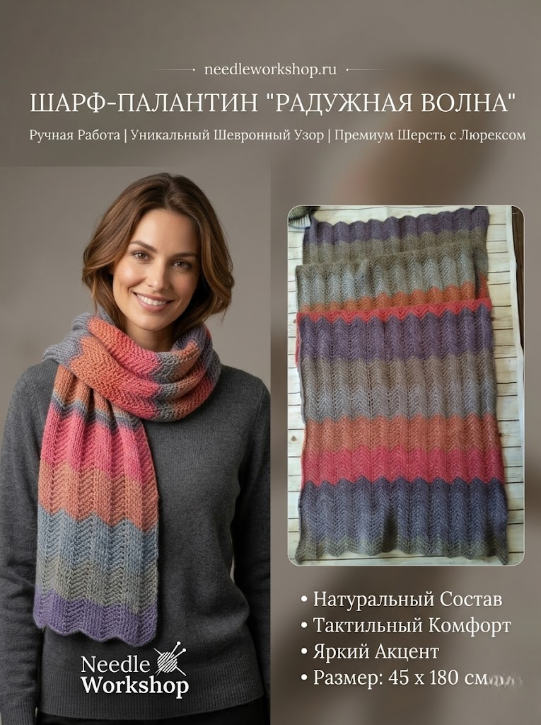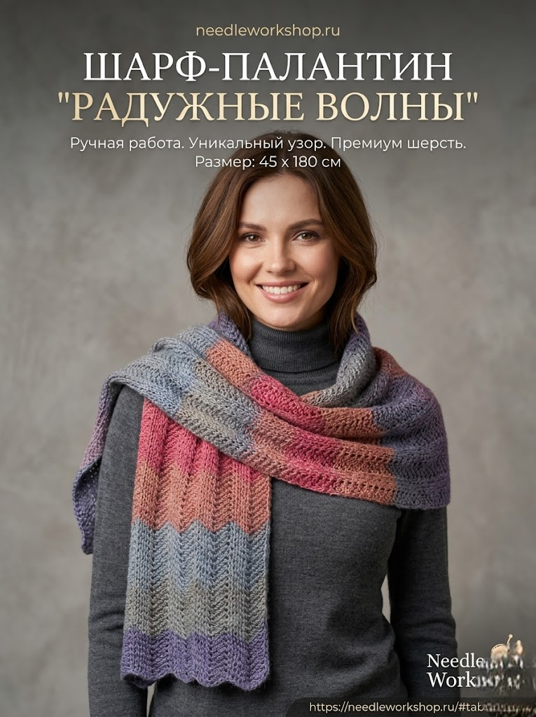 Мы доставляем шарф-палантин «Радужная волна» по Москве и России Если изделие не подошло, вы можете вернуть его в течение 14 дней без лишних вопросов. Заботимся о вашем комфорте и доверии к Needleworkshop.