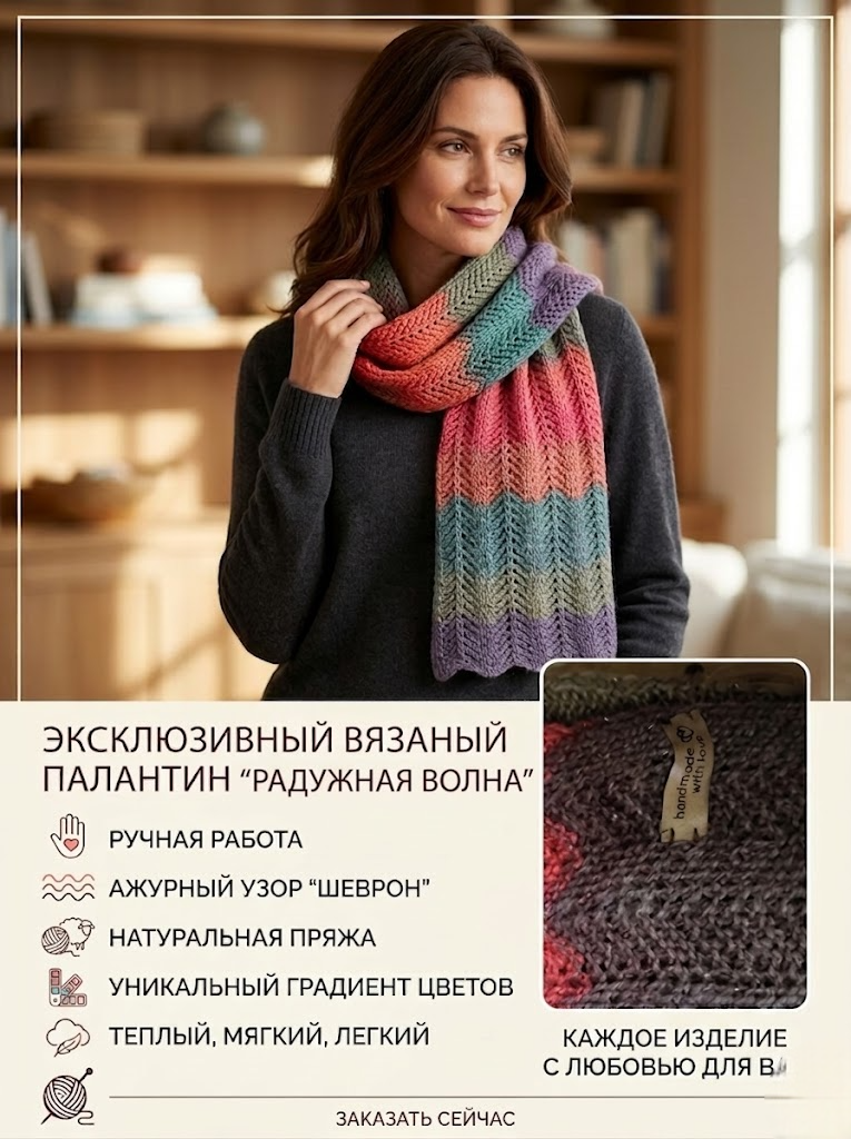 Ручная работа из качественной пряжи «Радужная волна» — экологичный, гипоаллергенный аксессуар, создающий атмосферу тепла и уюта. Идеально дополняет любой образ, дарит комфорт и заботу в каждом прикосновении.